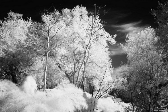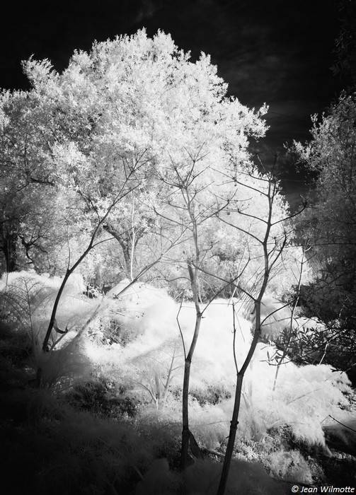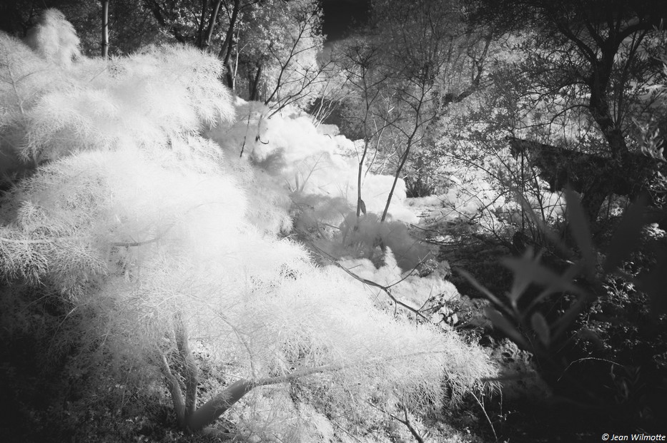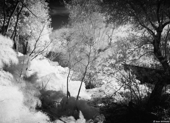 Durant cette phase, la photographie en noir et blanc via l’infrarouge, avec une balance des blancs étalonnée sur 4200k G9, permet d’obtenir des images quasi oniriques caractérisées par des masses à l’aspect neigeux.