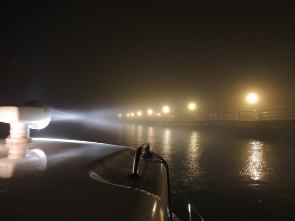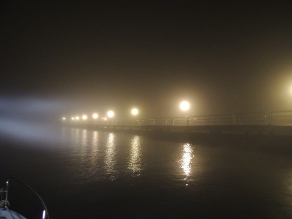 Route au 150° L’extrémité du pontile de Tuoro-Navaccia commence à se fondre dans le brouillard.