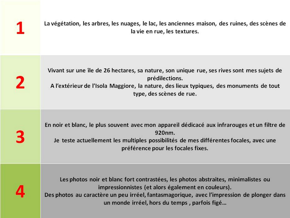 Dopo aver esaminato attentamente le mie foto preferite, ecco le mie risposte attuali a queste quattro domande :