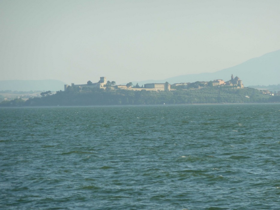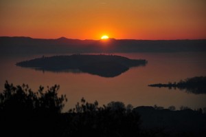 Vues des collines de Tuoro, l’Isola Maggiore et l’Isola Minore semblent fondues en un seul bloc comme l’acier le plus pur dans les forges de Vulcain.