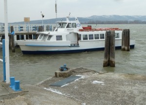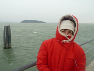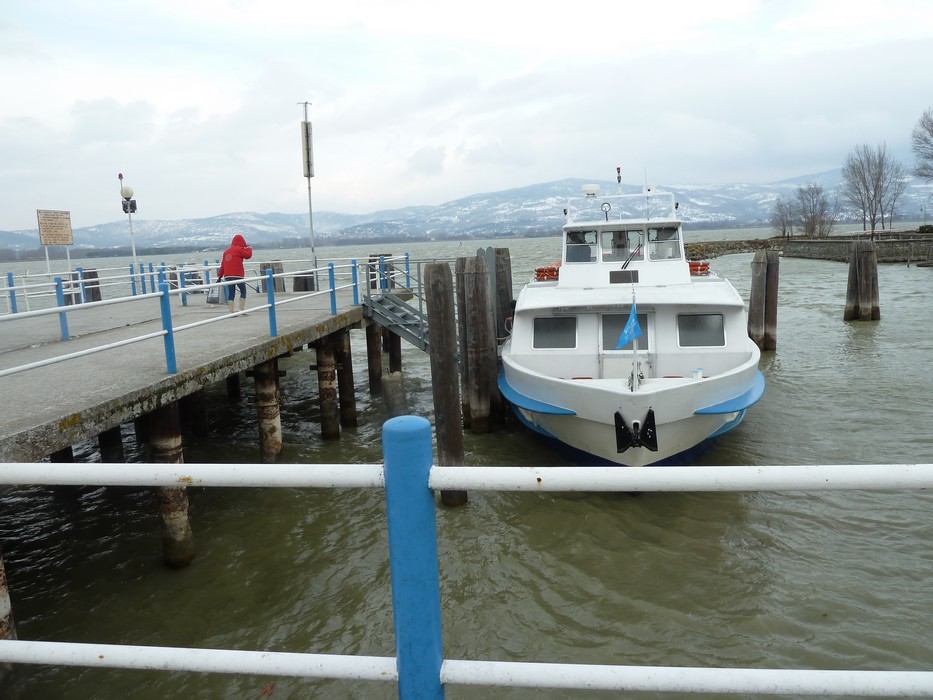 Le vent est fort violent sur le “pontile” et c’est pliée en deux que Fabienne s’efforce de gagner le traghetto.