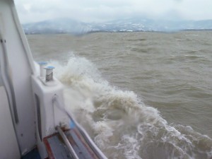 Je me rends alors sur le pont arrière d’où je peux plus aisément photographier le pugilat de l’Agilla II avec les vagues du Trasimène.