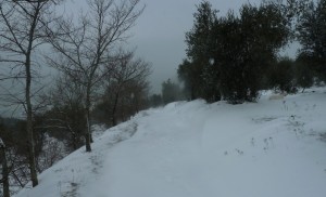 Descente par la strada di San Salvatore. L’exposition au vent balaie par moments le chemin de fortes rafales neigeuses…