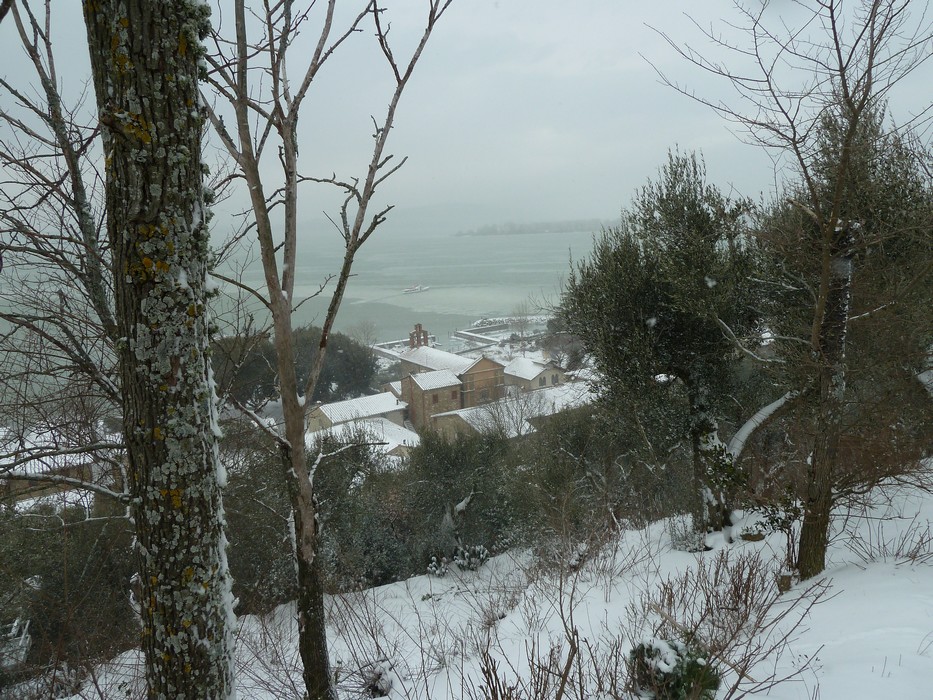 Le long du chemin, on bénéficie de belles vues sur la via Guglielmi aux toits enneigés et sur le lac Trasimène partiellement gelé…