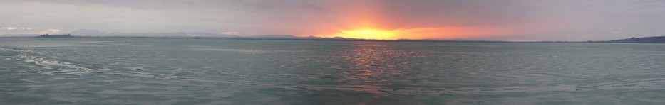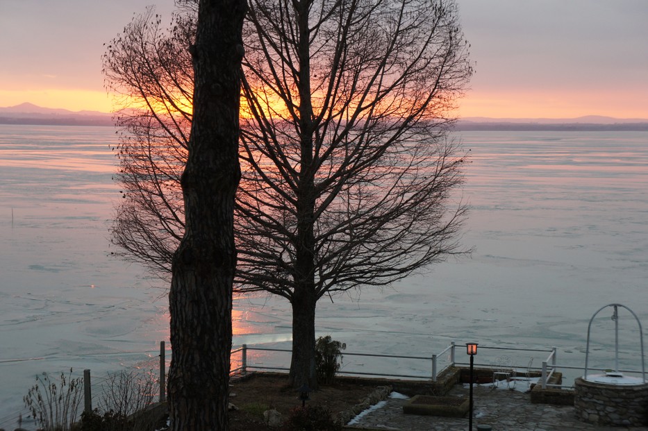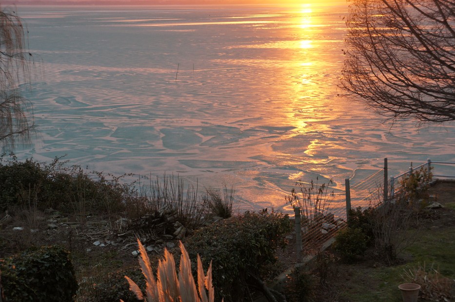 Vue panoramique du coucher de soleil sur le Trasimène gelé. Au fond à gauche, Castiglione del Lago. Au fond à droite, la Punta Navaccia - 18/02/2012, 17:36