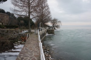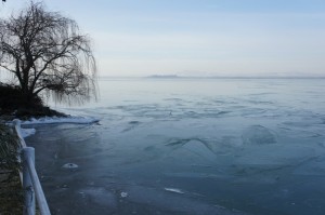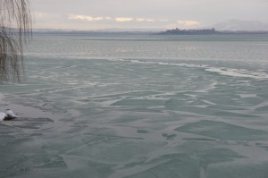 Vue du lac gelé en direction de Castiglione del Lago. Les plaques de glace sont de plus en plus épaisses et agrégées - 17 février 2012, 08:22
