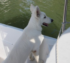 Naturalmente, Aïka, il mio pastore svizzero bianco, ha immediatamente saltato in mia barca fuoribordo per participare allo viaggio.