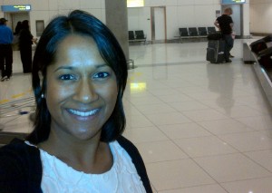 Madhubi à sa descente d’avion à Abu Dhabi après deux vols pour un total de 8:45 heures.