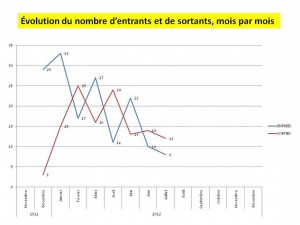 Depuis janvier, la tendance est à la diminution progressive tant des entrants que des sortants. En juillet, 5 % d’entrants et 8% de sortants ce qui est suffisant pour éviter à la fois une sclérose de notre groupe ou son implosion.