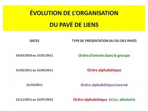 Au cours du temps, les organisateurs ont modifié à plusieurs reprises la présentation du pavé des liens avec les participants.