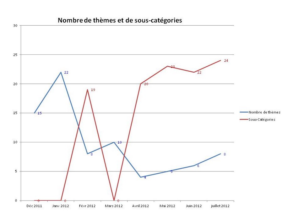 Ici, les courbes sont, à mon sens, simplement le reflet de mon changement de stratégie, à savoir , à partir de février, un classement en thèmes généraux, eux-mêmes subdivisés en sous-catégories, voire sous-sous-catégories.