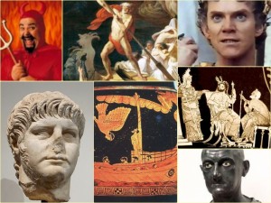 De haut en bas, et de gauche à droite : Lucifer, Néron, Charon, Ulysse, Caligula, Minos, Scipion.