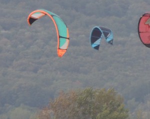 Cela nous vaut d’assister les jours de grands vents à un véritable ballet coloré sur le lac en face de notre jardin.