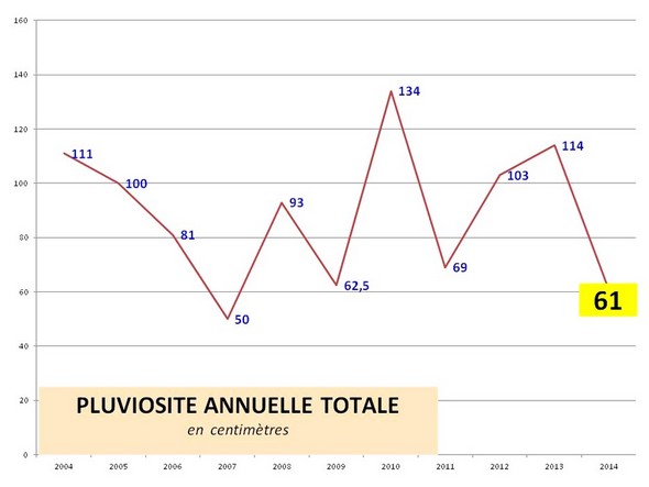 Enfin, le diagramme ci-dessous met enfin en évidence qu’ au cours des quatre premier mois de 2014, il a déjà plu pratiquement autant qu’au de l’année entière en 2007, 2009 et 2011, années les moins pluvieuses de la dernière décennie.