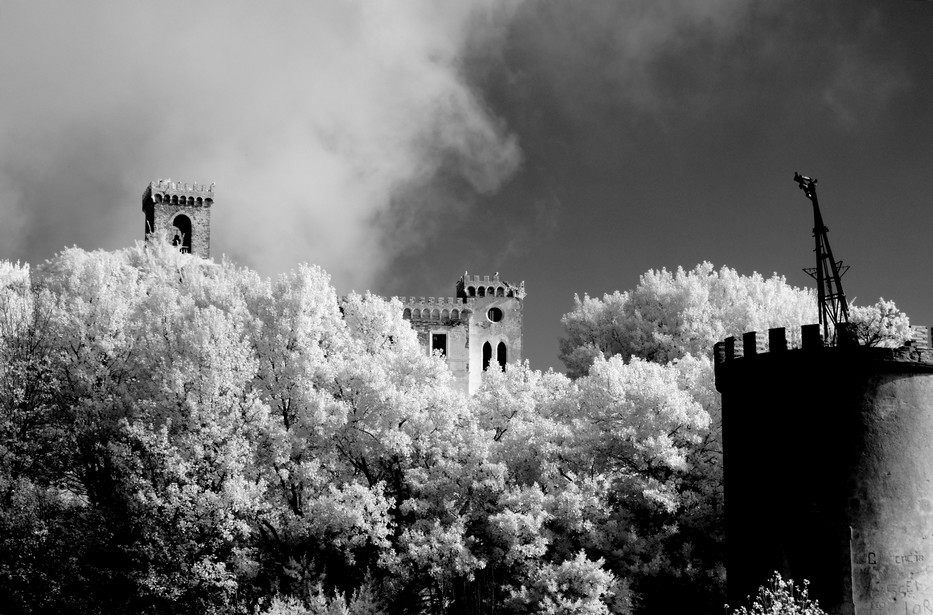 Autre vue générale de la partie néo-gothique de la façade Est – En haut, à droite, le campanile de l’ancienne église San Francesco, intégrée désormais au château.