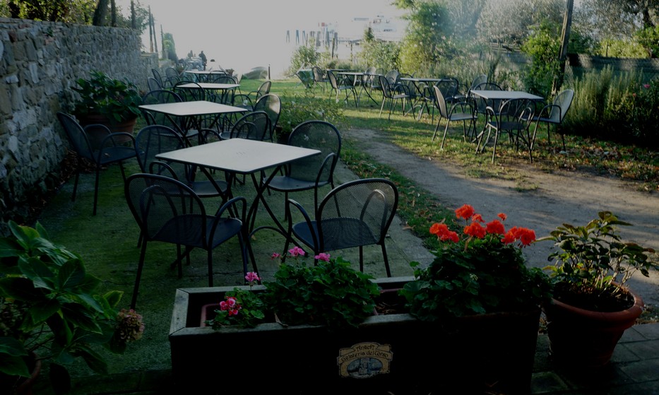 Le jardin du bar de Silvia, au bord du lac Trasimène, et proche du débarcadère des “traghetti”.