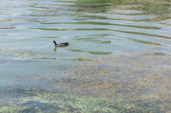 Les canards évoluent entre les agglomérats d’algues le long de la rive au niveau de Tuoro-Navaccia – AOÛT 2012.