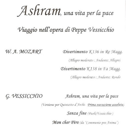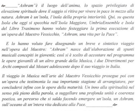 Ainsi, dans le cadre de l’événement annuel “Isola Maggiore, Isola del Libro“, Italo Marri a invité un groupe prestigieux, l’Ensemble d’Ombrie à venir exécuter dans l’église du Bon Gesù plusieurs oeuvres de musique classique dont « Ashram » le tout nouvel opus du compositeur et chef d’orchestre italien Giuseppe Vessicchio.