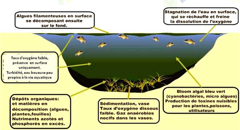 C’est un processus naturel et très lent, par lequel les plans d’eau reçoivent une grande quantité d’éléments nutritifs ( notamment du phosphore et de l’azote ), ce qui stimule la croissance des algues et des plantes aquatiques.