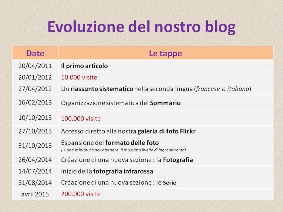 La seguente tabella presenta le principali tappe nell’evoluzione del nostro blog.