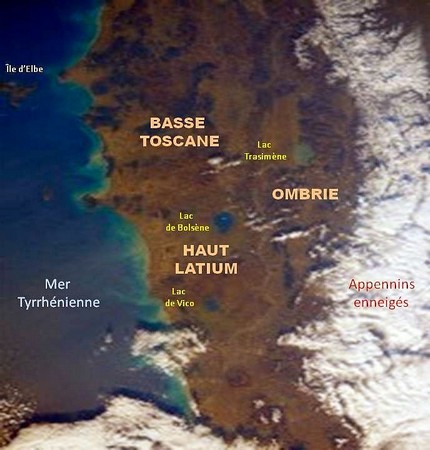 Cette fois, c’est une photo à plus grand angle, comprenant le bas de la Toscane, l’ Ombrie et le haut du Latium qui vous est présentée.