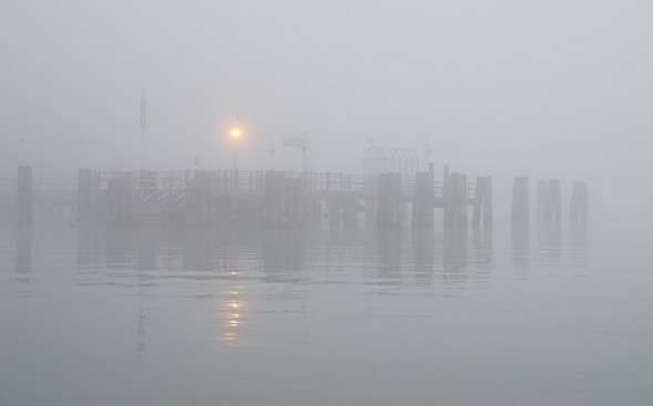 L’extrémité du pontile de Tuoro-Navaccia commence à se fondre dans le brouillard.