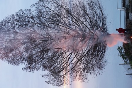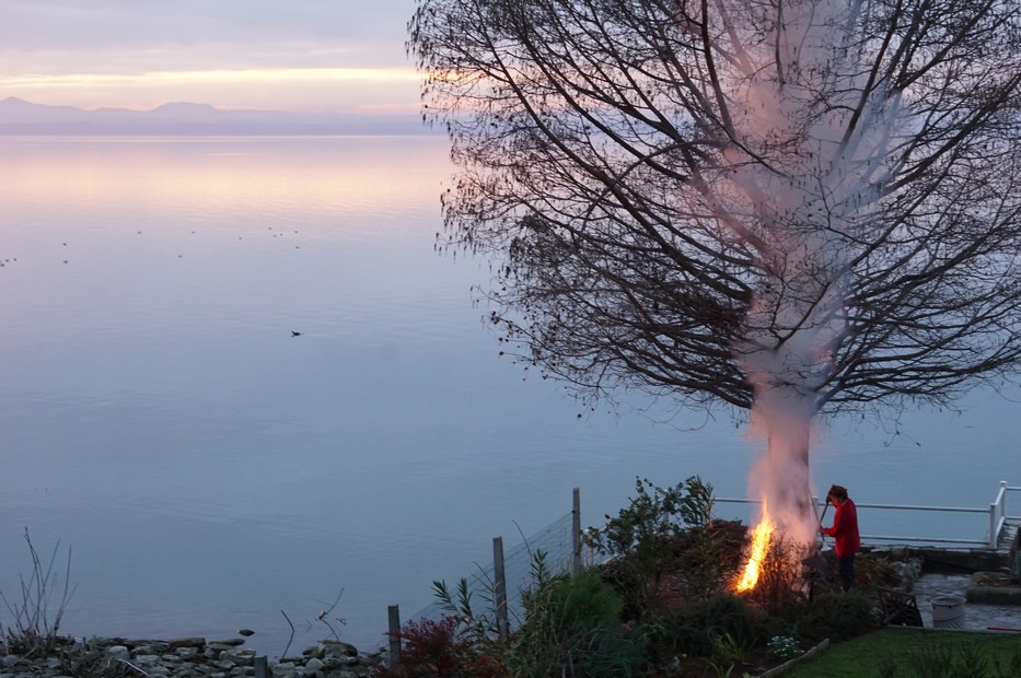 Au crépuscule, le feu de Fabienne face au lac Trasimène.