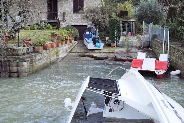 Tôt matin, les vagues continuent à s’acharner sur notre pauvre “pilotina” déjà chavirée dans notre darsena… Mercredi 10 février 2016 – 07:05