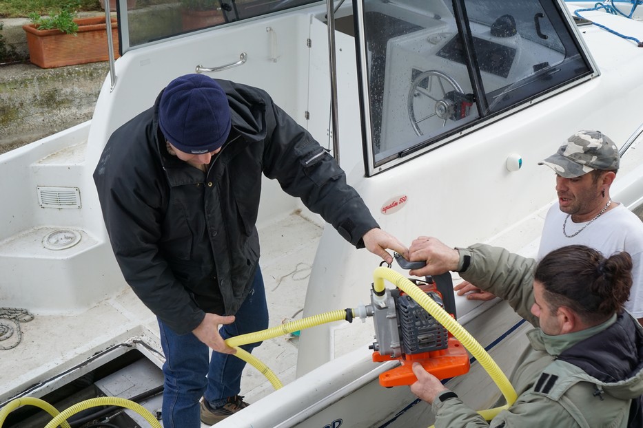 La mattina del terzo giorno, Massimiliano Mancinelli (Motonautica) è intervenuto con la sua abituale prontezza per completare il pompaggio dell’acqua nelle strutture in fondo della nostra barca.