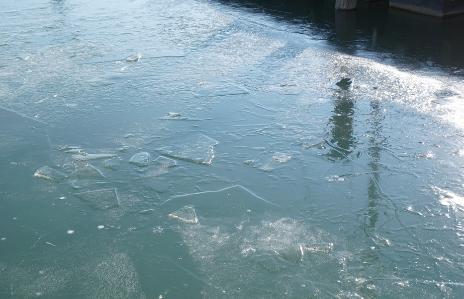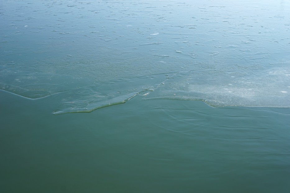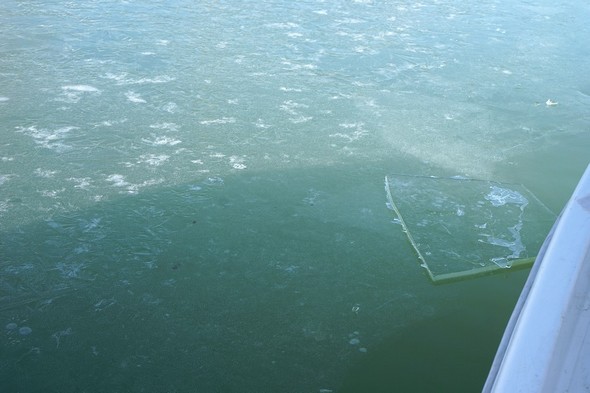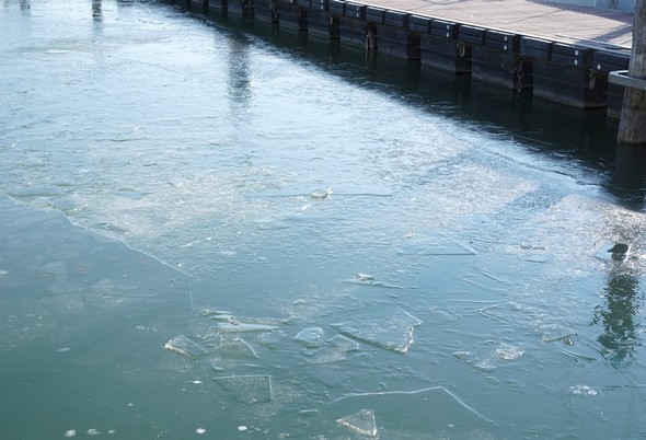 Vue rapprochée sur cette plaque unique de glace en voie de formation entre les deux pontons.