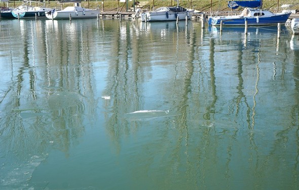 Là aussi, dans le chenal d’entrée, on observe des plaques de glace naissantes, mais plus isolées en raison du passage fréquent des barques.