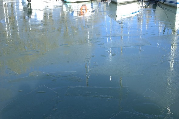 Plaques de glace en formation devant les voiliers amarrés au flanc ouest du premier ponton flottant.