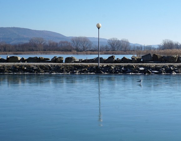 Un premier oiseau teste la consistance de la plaque de glace le long de la digue du Porto del Sole.