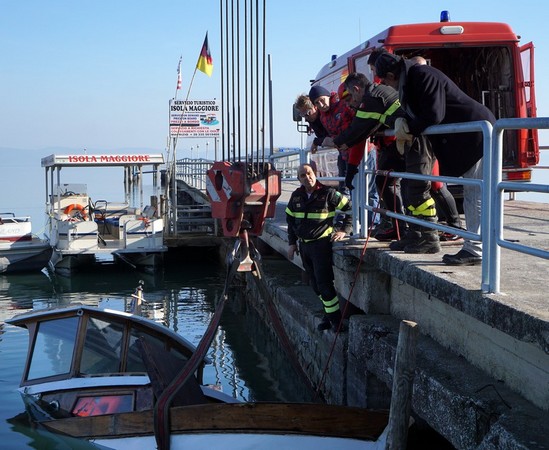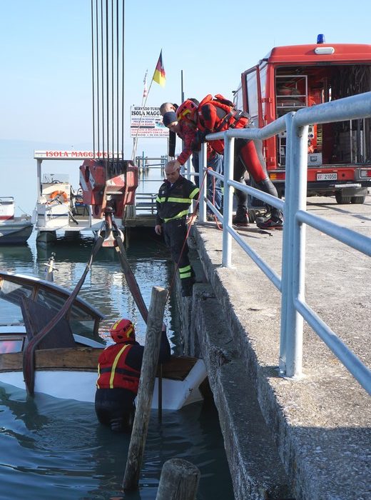 Una squadra dei vigili del fuoco con attrezzature pesanti ha preso posto all’inizio del pontile a Tuoro-sul-Trasimeno.