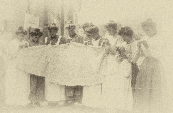 Via Guglielmi, uno gruppo di isolane imparando l’arte del merletto.