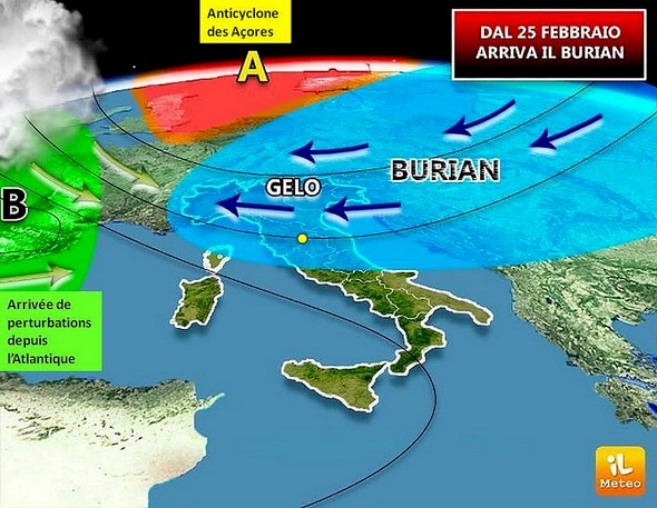Rappel : le Burianest un vent sibérien glacial qui déboule en Italie tous les 5 à 7 ans et qui est capable d’entraîner des chutes de la température de l’ordre de -10° à -12° en moins de 24 heures