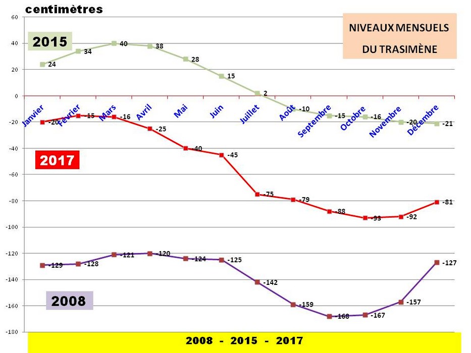 Variations du niveau du Trasimène : 2008 (notre première visite), niveau au plus bas. 2015, niveau le plus élevé depuis longtemps ! 2017 (dernière année écoulée), chaleurs estivales anormalement élevées et longues aboutissant à une perte régulière d’eau tout au long de l’année…