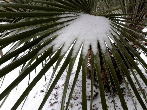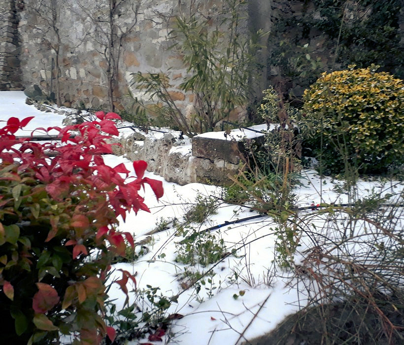 Ce deuxième épisode de neige a été moins abondant mais il s’est par contre fait accompagné par un gel plus drastique qui se discerne assez bien dans certaines parties de l’allée centrale de notre jardin.