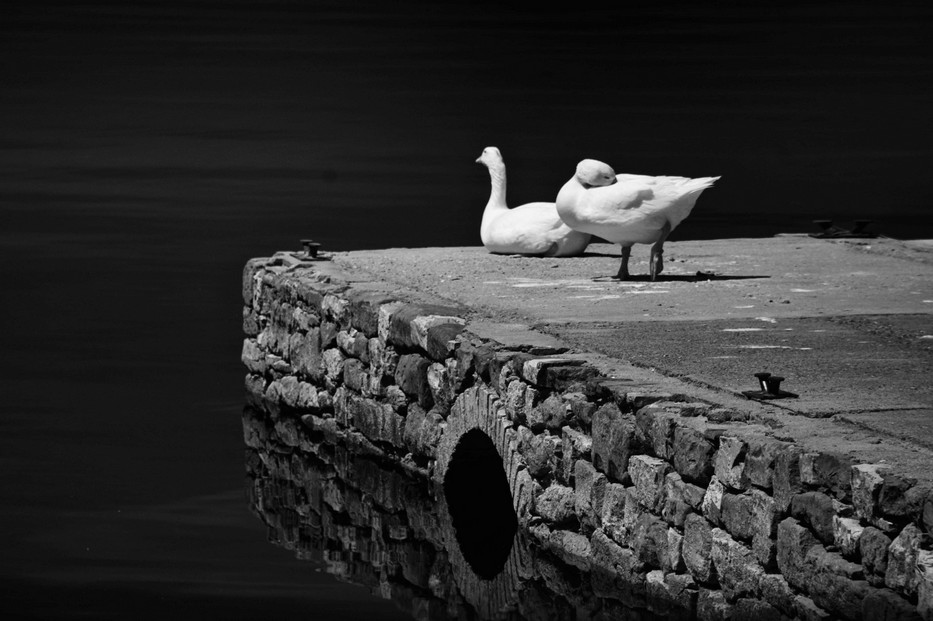 Pontile du restaurant L’Oso, et ses locataires habituels, les oies de l’Isola. 26 avril 2018 – 12:43 1/30° – f/8 – 210 mm – ISO 200