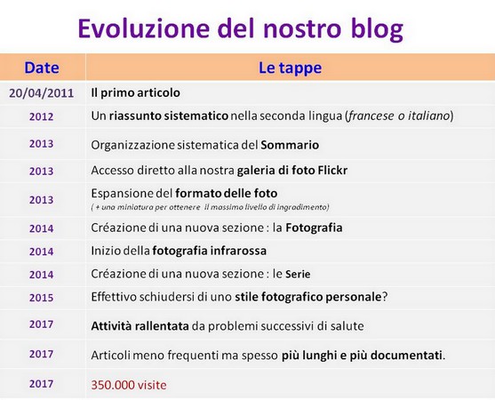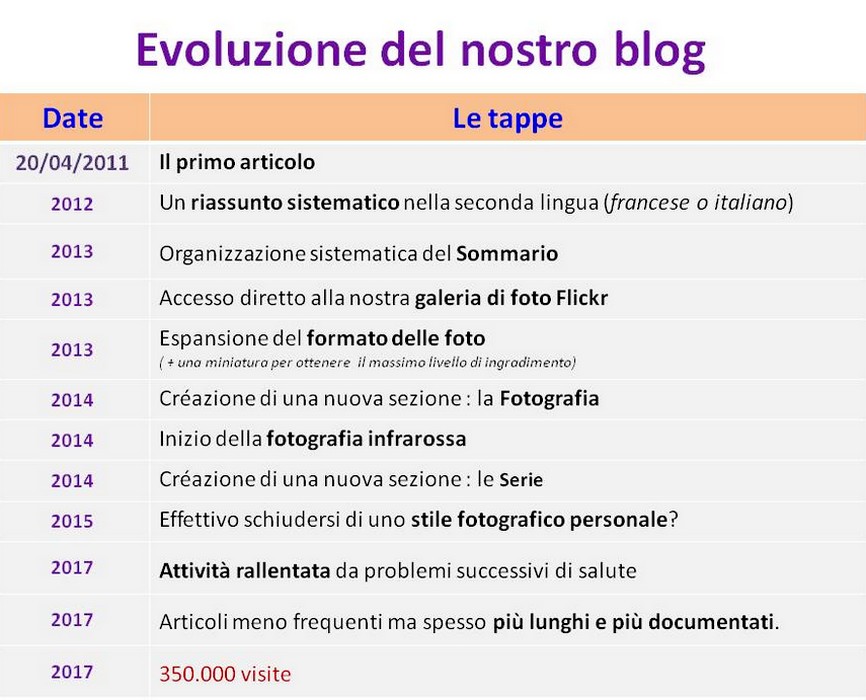 Comme lors de précédents anniversaires du blog, nous vous résumons à grands traits (en un seul tableau) les différentes étapes franchies au cours de la maturation du blog au fil des années :