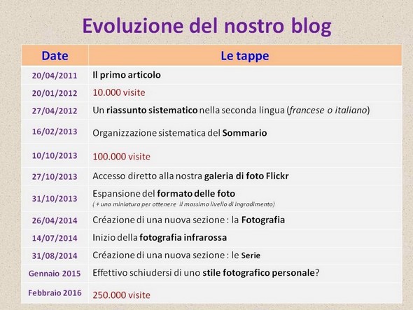Comme lors de précédents anniversaires du blog, nous vous résumons à grands traits (en un seul tableau) les différentes étapes franchies au cours de la maturation du blog au fil des années :