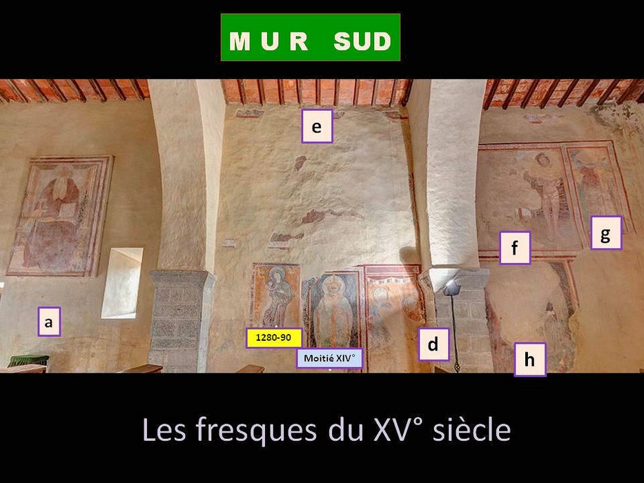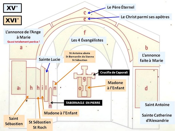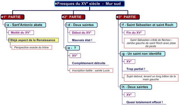 Sont du XV° siècle les fresques a, d,e, f, g, h. En rouge : très mauvais état !