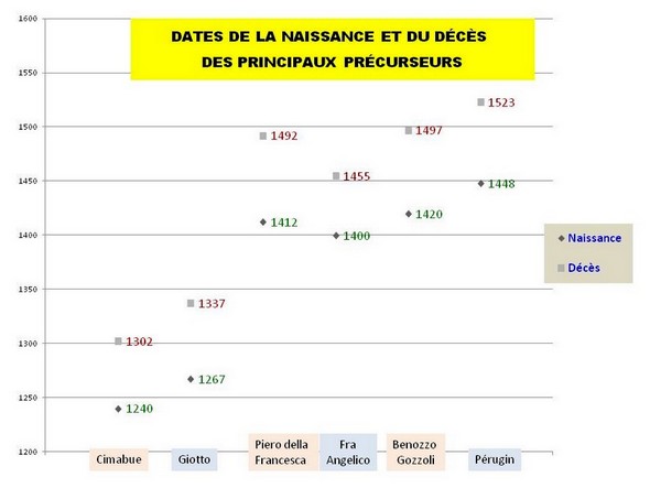 Pour vous aider à vous situer dans le temps, je vous joins un tableau reprenant les dates de naissance et de décès des principaux peintres précurseurs de la Renaissance.